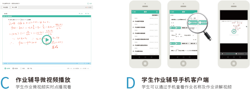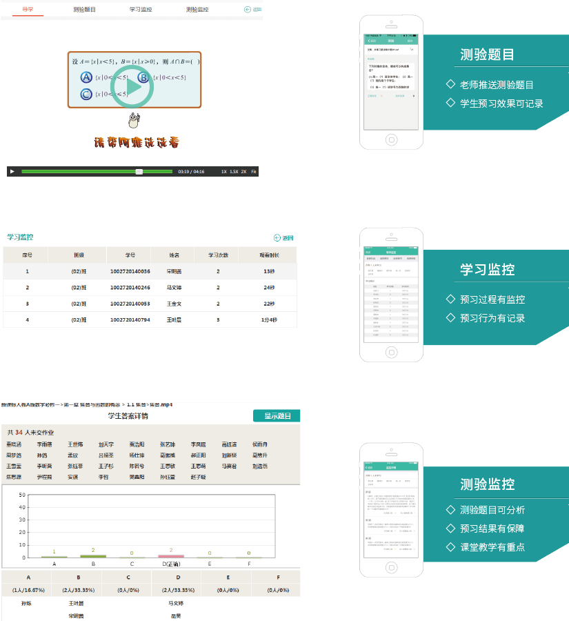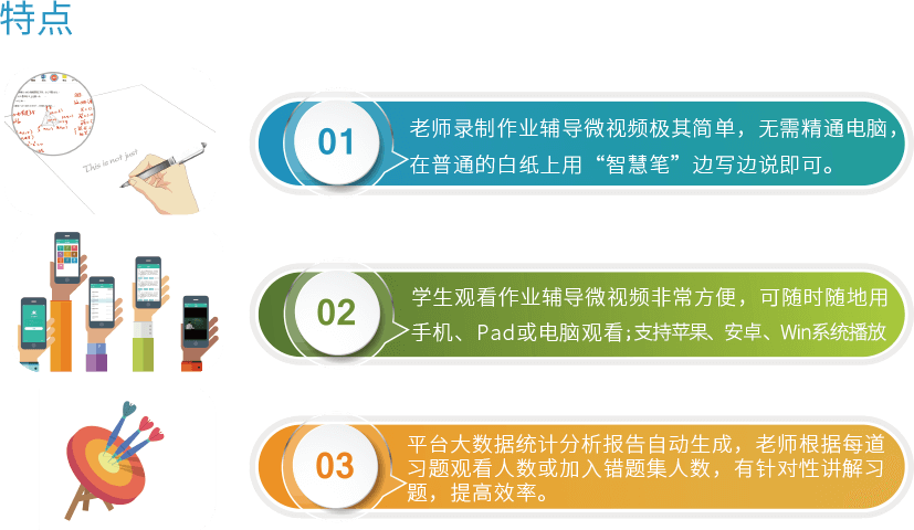 HappyClass Homework Guide System solves each student's problem through "one-on-one" style tutoring. If confused by a homework exercise, the student can watch a micro video recorded by the teacher through a phone,Pad or computer to hear the thorough explanation. The teacher can target specific questions when explaining the homework according to the statistics automatically generated by the system. Through keeping track of the number of viewers for each video explanation and the number of questions added to the commonly mistaken problem sets, the teacher can improve the effectiveness of teaching.