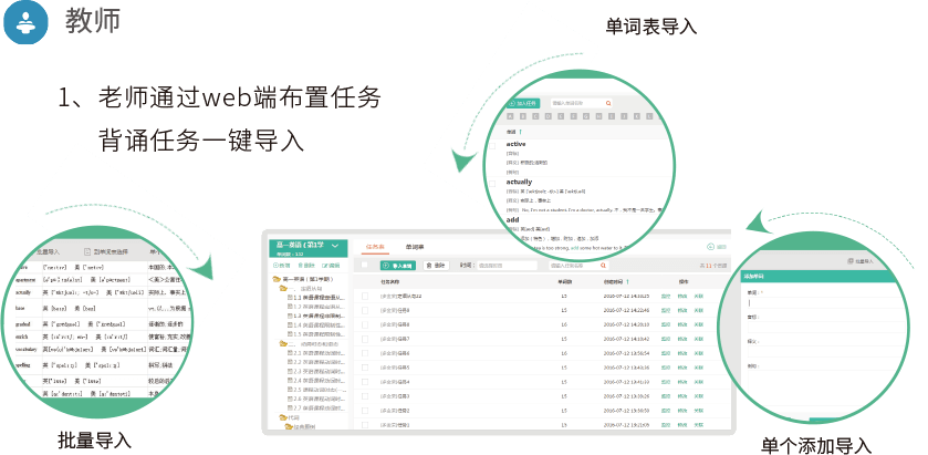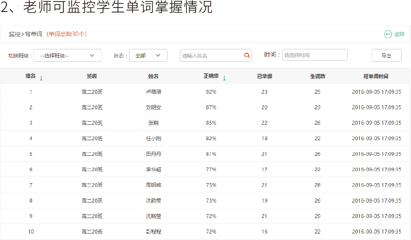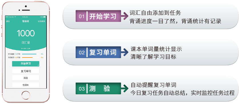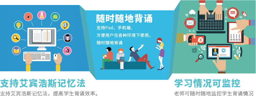 Vocabulary Learning System is a self-learning system designed to assist students with mastering English words. Recitation, review, testing and word lists can be released as vocabulary assignments through the Smart Classroom Platform. This system assists students by organizing self-study vocabulary lists according to the text book chapter index, helping them save time learning English and improving their memorization efficiency.