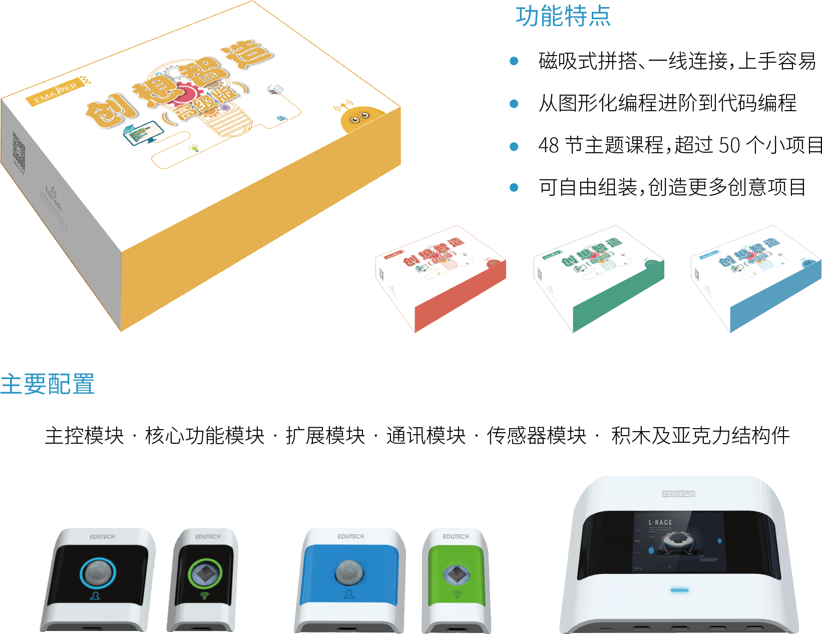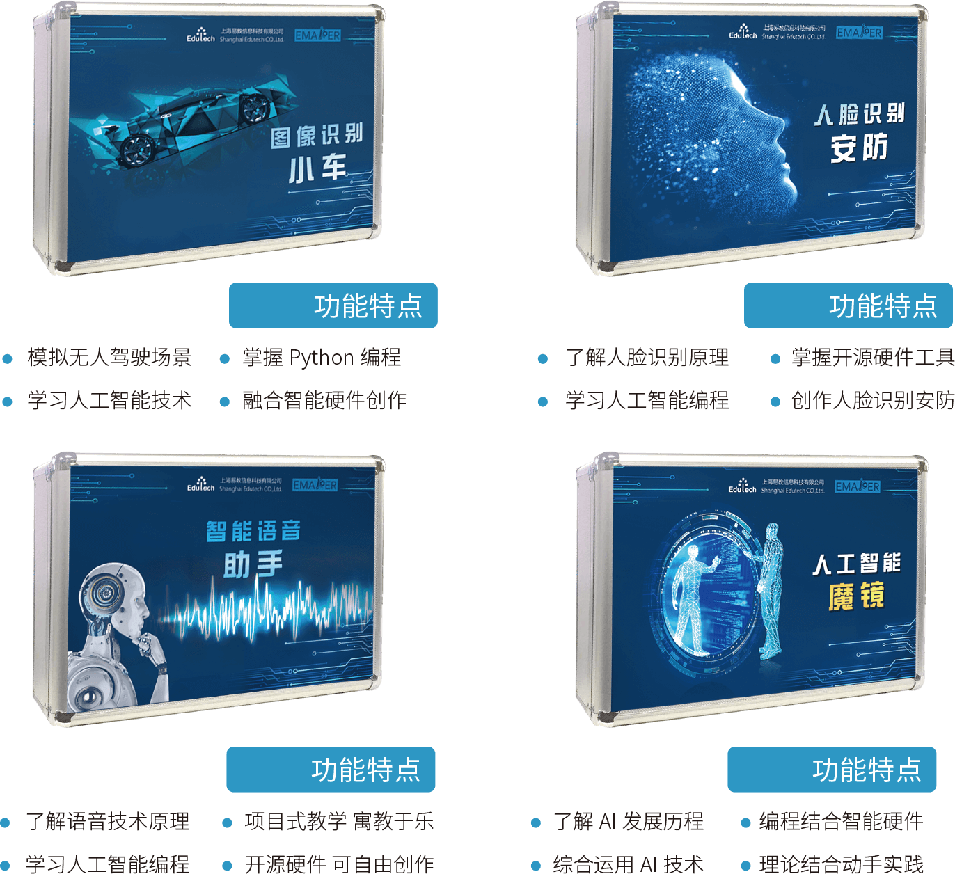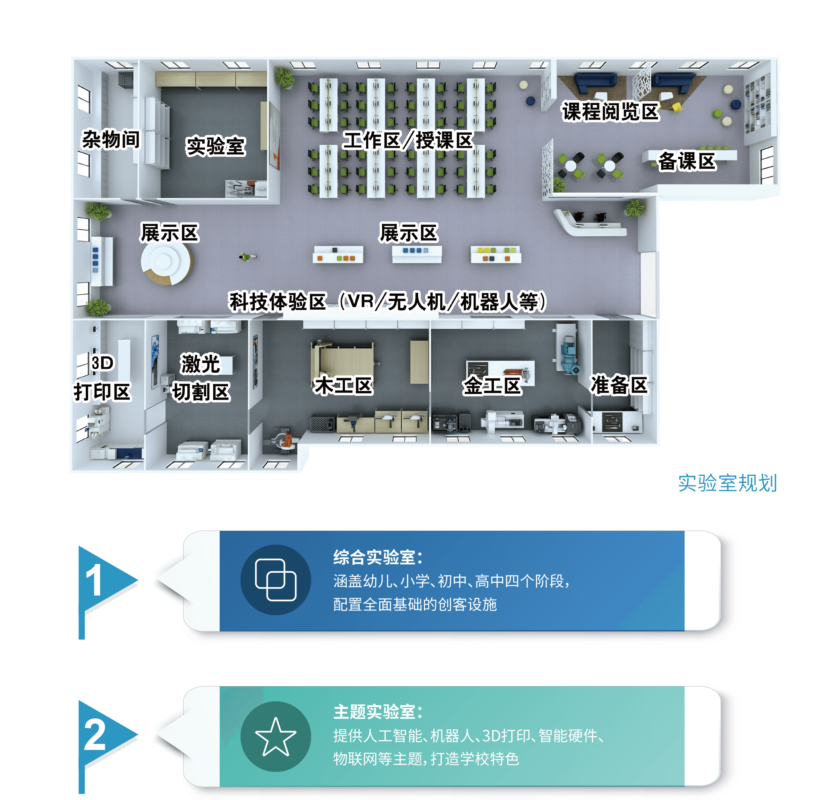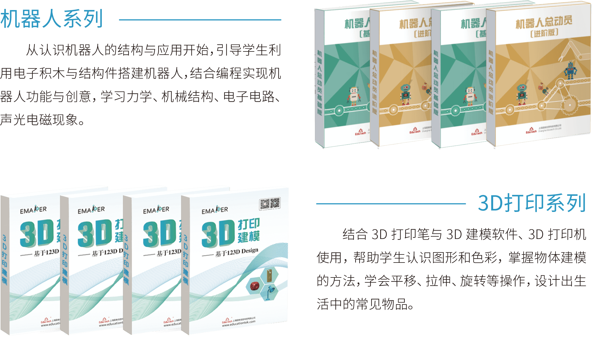 The eMaker maker space kits primarily consist of modules combining smart hardware and programming, robotics, 3D printing, VR, the Internet of Things, science and technology experiences, and engineering manufacturing. Engineering manufacturing modules include metalwork, woodworking, laser cutting, weaving, ceramics, and more.