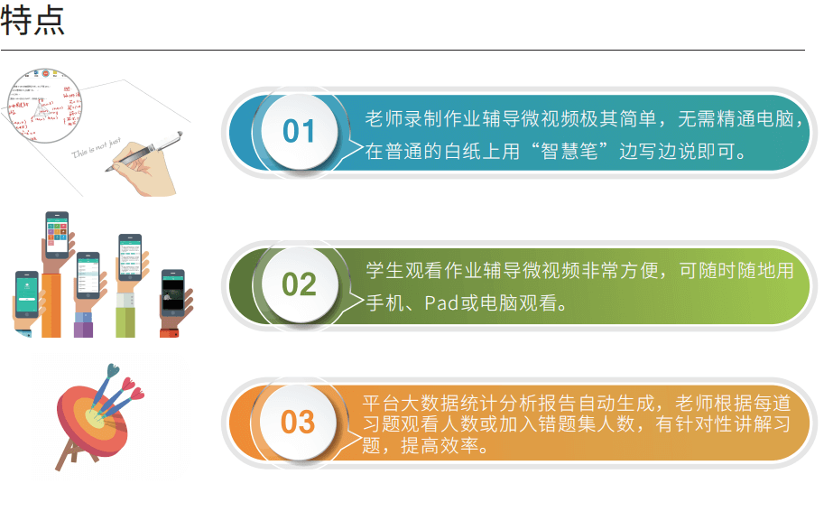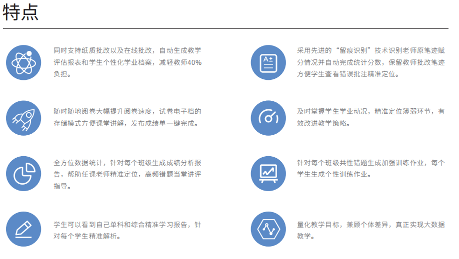教师可以布置上传作业、教辅作业、题库作业、打卡作业等多种类型,在多终端上批改,系统 自动统计,生成多维度学情报告,方便老师快速定位问题学生、疑难知识点、高频错题,再针对性 的录制讲解视频推送给学生。学生可以通过学习机反复观看,解决学生作业“一对一”个性化辅导 问题