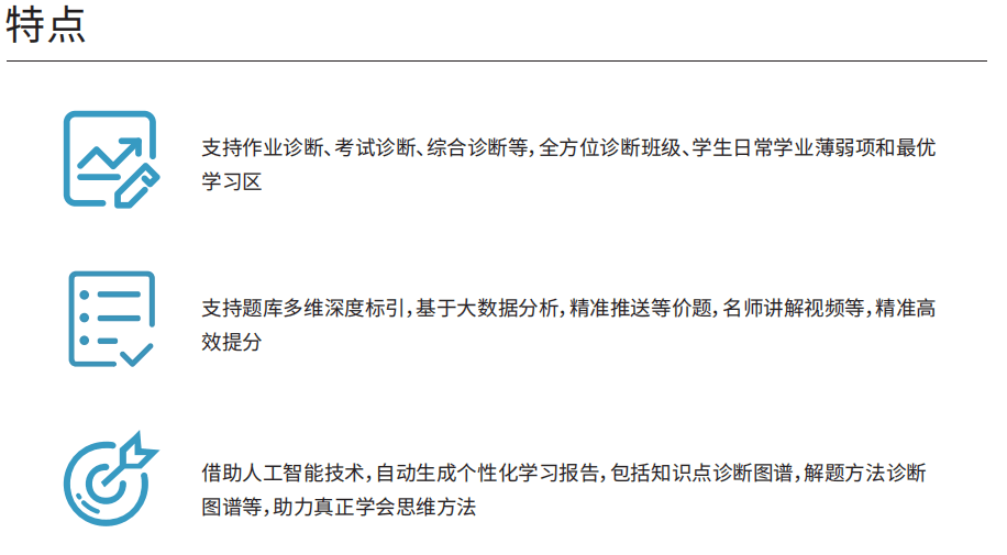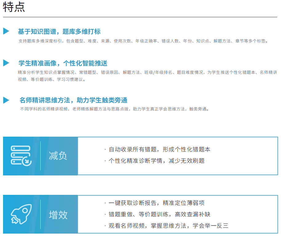 高考提分系统,基于高三每轮复习的教辅、试卷分析,精准定位学生的薄弱项,为每位学生定 制个性化的高考提分方案。学生可以随时随地自主收录错题,自动生成个性化错题本和精准诊断报 告。快速定位知识点、解决方法薄弱项,推送高考模拟题、历年真题、等价题、名师精讲等,从而 实现精准提分。