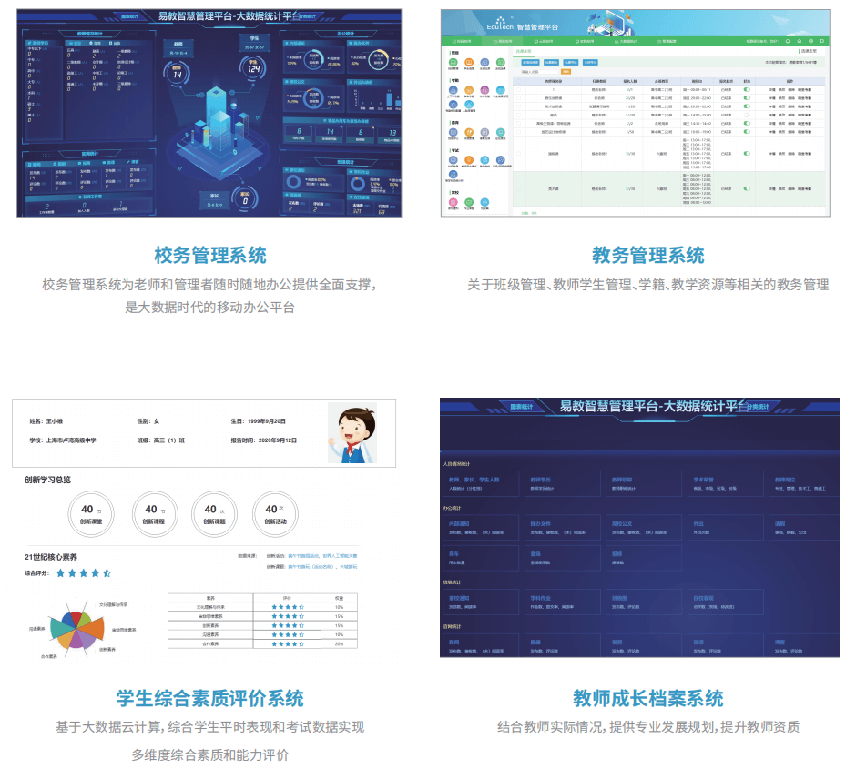 智慧管理平台涵盖校务管理系统、教务管理系统、学生综合素质评价系统、教师成长档案系 统。平台支持各类教育数据的采集、汇聚、管理和分析,实现线上线下融合管理,全面提高管理效 率。