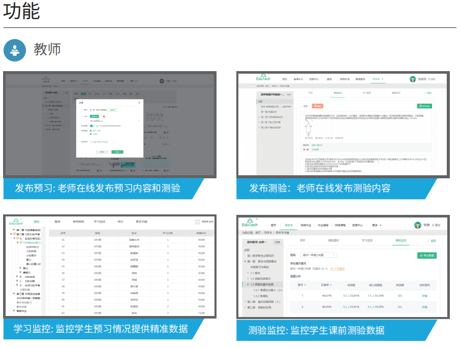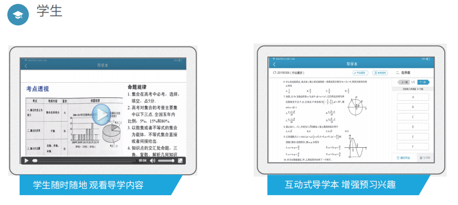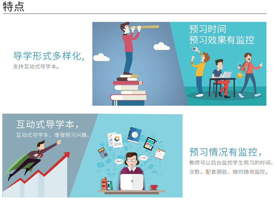 导学预习系统为学生提供多样化的预习和测验。老师可推送各种形式网络课程及配套资源和测 试题目,并通过平台监控学生的预习情况,发现学生薄弱点,为备课及课堂精准教学提供数据参 考。该系统可以有效培养学生自主学习习惯和提高课堂教学质量。
