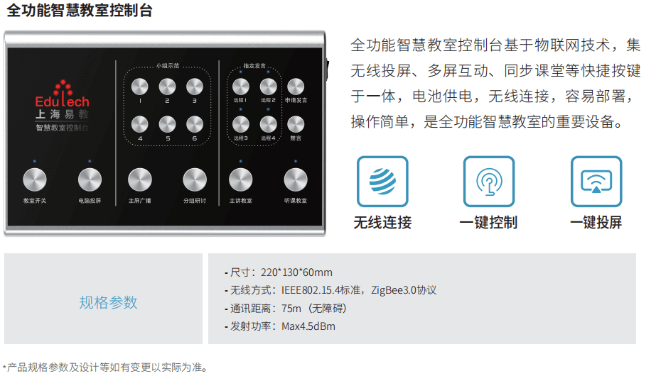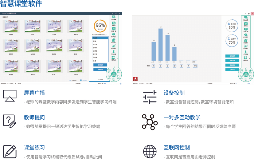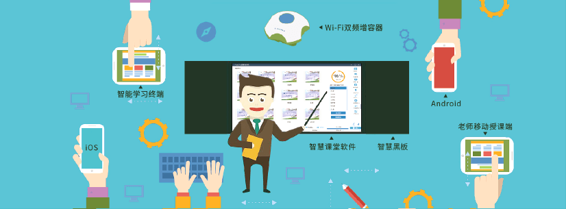 智慧课堂系统基于物联网技术,以智慧黑板为中心,无缝连接移动学习终端、录播、PC、手机等设备, 实现了老师与学生双向实时“一对多”互动教学,同时也能实现课堂教学数据自动采集,教室环境智能感知, 教室高密度 Wi-Fi 覆盖,智能录播、课堂评价、移动授课等功能,切实提高教学质量和教学效率。