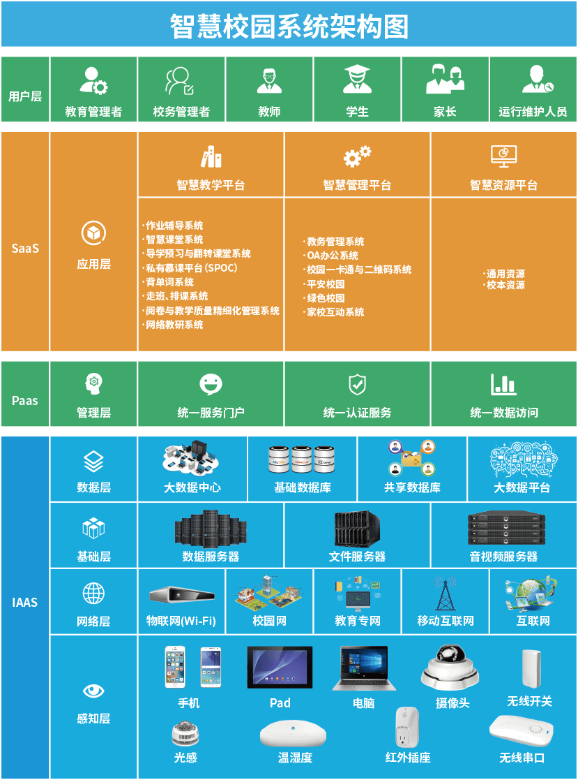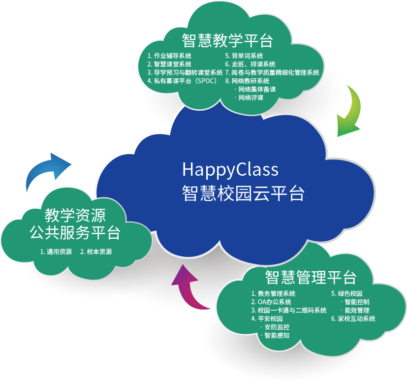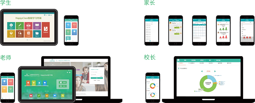 HappyClass全场景智慧校园系统以智慧校园云平台为核心,基于物联网覆盖技术,将教学、管理和家校互动功能移到手机和Pad等智能设备上,实现了“学习办公随时随地,教学和管理源于大数据,沟通和互动无处不在”。